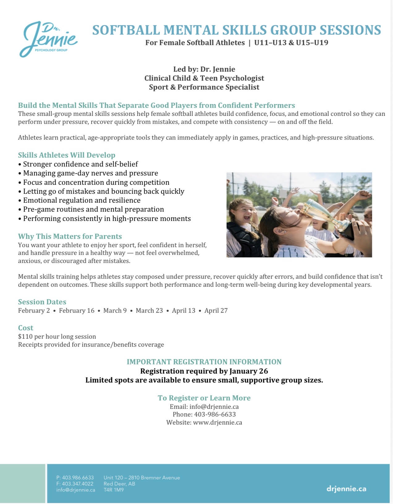 Parents often tell her they want their athletes to enjoy their sport, feel confident, and handle mistakes without spiraling or shutting down. Mental skills training helps athletes compete with confidence while developing coping skills that transfer beyond sport. Her passion for working with softball athletes comes from watching her oldest son play baseball and navigate the unique mental challenges these sports posses.